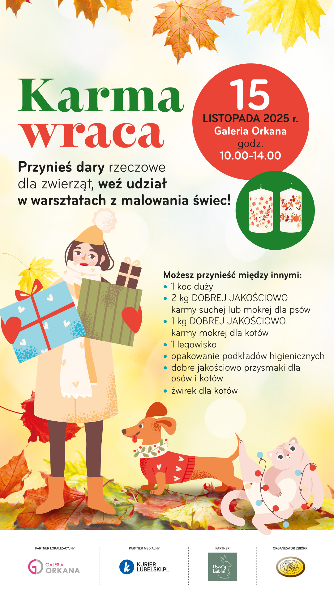 Już 15 listopada 2025 r. w Galerii Orkana w godz. 10:00–14:00 odbędzie się zbiórka darów dla zwierząt połączona z warsztatami malowania świec! ![]()